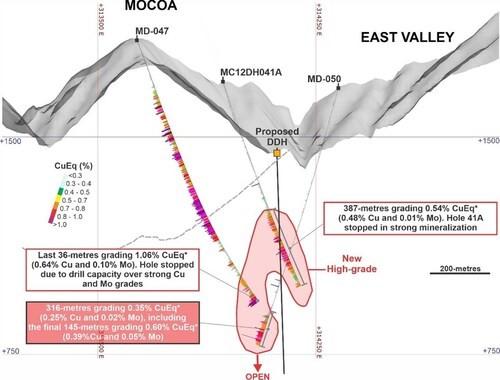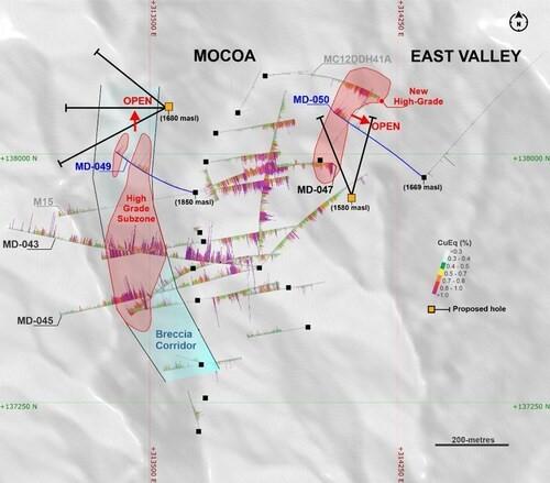 MD-050 was strategically designed with two objectives: (i) to connect the geology between East Valley and the Mocoa deposit, and (ii) to extend the high-grade Cu-Mo mineralization seen at the end of MD-047 (refer to news release dated July 30, 2025) and northward towards historic high-grade results from hole MC12DH041A (drilled in 2012 by B2Gold).