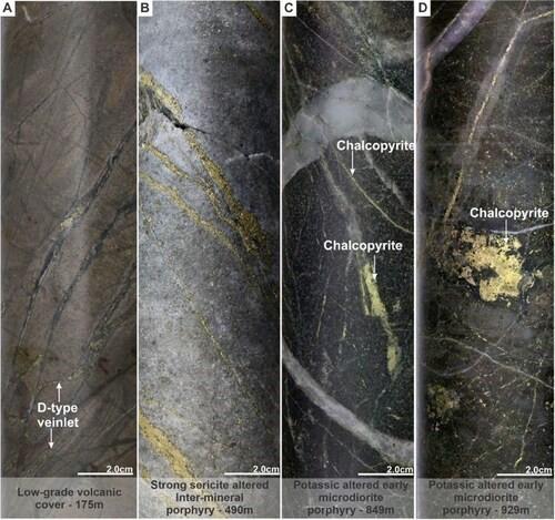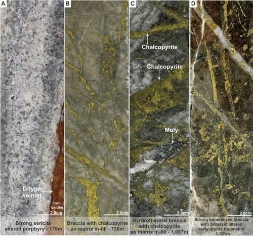 The upper portion of the breccia is characterized by low-grade Cu-Mo mineralization and multiple strongly sericitized volcanic and dacite porphyry fragments with early A, B and C-type veinlets. Downhole, the low-permeability crackle-breccia transitions to a hydrothermal-breccia (more fluidized) with chalcopyrite (see figure 3B) and minor molybdenite content as matrix in-fill, cemented early diorite (E0) and dacite (I1) porphyry fragments (see figure 3C). Hole ended due to drill rig capacity in a breccia containing early diorite (E0) fragments altered to secondary (hydrothermal) biotite, locally overprinted by chlorite and chalcopyrite as matrix in-fill and as C-type veinlets (see figure 3D).
