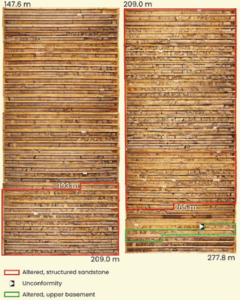 Basement-rooted faulting is interpreted to extend through the entire 220-meter thickness of the sandstone as faulting is evident beginning at the top of bedrock. These vertically extensive structures control broad zones of hydrothermal alteration. In MLN25-010, nearly half of the sandstone is structured including a 70-meter interval with strong fracturing, faulting, fault gouges, increased clay content and sections of near-massive clay, rotated sandstone bedding, strong bleaching, desilicification, and decimeter-scale zones of increased radioactivity.