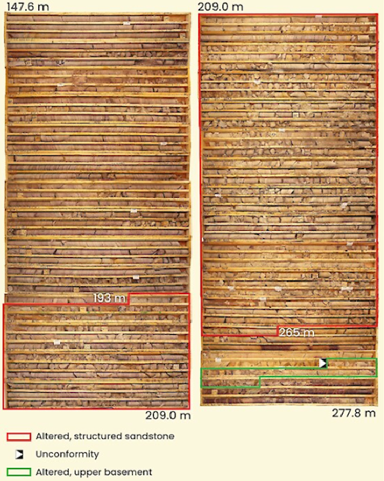MLN26-013 intersected broad zones of moderately to strongly altered sandstone from 200 meters to the unconformity at 299.4 meters. The strongest structure was intersected from 221 to 242 meters and is pervasively bleached and desilicified. The basal 9 meters of sandstone contains meter-scale zones of moderate to strong argillization within broader pervasively bleached sections and hosts hydrothermal hematite in the basal 1 meter.