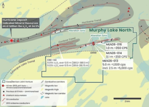 Initial drilling in winter 2025 confirmed that up to 2 kilometers of Hurricane trend basement geology is present within the project. While testing the southern portion of the Hurricane trend, the fourth and final drill hole of the program intersected a broad zone of alteration and structure in the lower sandstone that is open along strike in both directions. The depth to the unconformity at Murphy Lake North is approximately 250 meters.