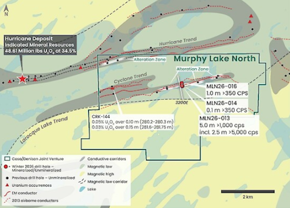 Cosa appears to have made a discovery during its 2026 winter drill program at Murphy Lake North. Hole MLN26-013 intersected 5.0 meters of anomalous radioactivity, registering up to 13,900 Counts Per Second (CPS) in the upper basement approximately 260 meters vertically from surface.