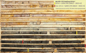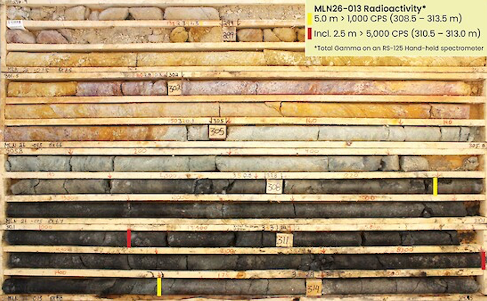The first drill hole of the program, MLN26-013, intersected the strongest radioactivity including a 5.0-meter interval of continuously anomalous radioactivity in the upper basement. Two holes were completed to directly follow up radioactivity in MLN26-013. Two additional holes were completed to define underlying geology ahead of summer drilling and follow up another radioactive intersection. All drill holes were completed on Section 3200E.