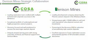 As Cosa’s largest shareholder, with equity rights to retain up to 19.95% ownership, Denison gains exposure to Cosa’s potential for exploration success and its pipeline of uranium projects.