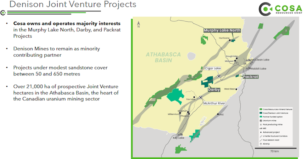 Cosa has acquired a 70% interest in and will operate the Murphy Lake North, Darby and Packrat uranium projects. Denison Mines will remain as minority contributing partner.