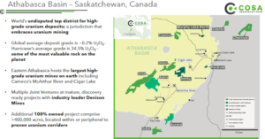 In comparison, the Priargunsky underground uranium mine in Russia has grades of just 0.15%. Or Rio Tinto’s Rossing open-pit mine in Namibia, with grades of 0.03%, compared to over 19% in Denison’s Phoenix deposit – a difference of 630X. Hurricane, the deposit that Cosa’s management team is credited with discovering, averages an astonishing 34.5% and is just a few kilometres away from Cosa’s Murphy Lake North joint venture.