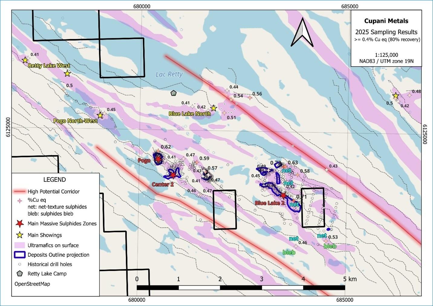 Brian Bosse, CEO of Cupani, commented: “I could not be happier with what Jacquelin’s team accomplished in 2025. Any of these new zones could prove fruitful: they have similar geophysics and surface sample metal values to the known historical mineralization. Blue Lake North will be a drill target this winter. The entire project’s opportunity set continues to improve.