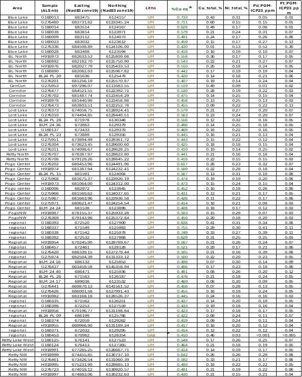 Ground follow-up was conducted at Retty Lake West near historical drill hole A-27 (Figure 3). Metric-scale angular felsenmeer blocks of ultramafics were identified, trending NW-SE and containing up to 10% visible sulfides (pyrrhotite and chalcopyrite) with net-textured sulphides. Assay results range from 0.45 to 0.52% Cu eq. Historical drill hole A-27, 350 meters north-west from the blocks, intersected:
