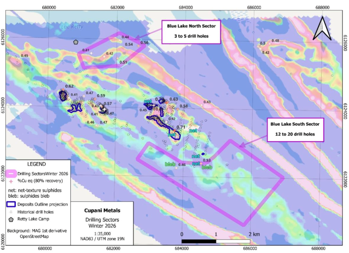 Cupani’s 2026 winter drill program ranges from 15 to 25 holes for a total of between 3000 and 4000 meters. The program is designed to test the interpreted extension of the Blue lake mineralisation to the South-East along the High-Potential Corridor (click: 27 February 2026 press release for description).