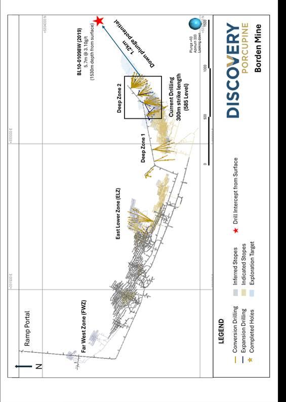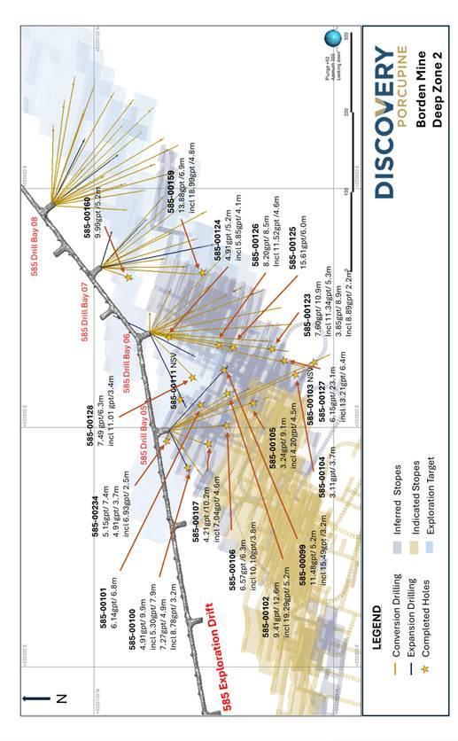The holes reported today represent the first phase of a 30,000 m drill program at Borden, including 20,000 m of in-mine drilling designed to cover a 300 m strike length of the Main Zone near the current northeast limit of inferred resources, as well as 10,000 m of drilling focused on district targets around the mine. All in-mine drilling is being planned from cut outs located in the east portion of the 585- exploration drift, situated in the hanging wall of the zone.