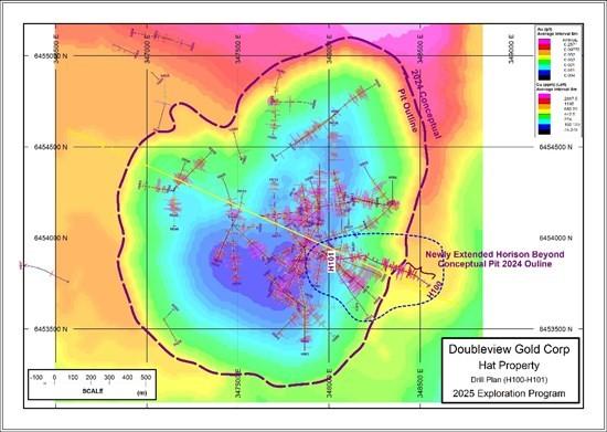 Doubleview Gold Corp. (TSX-V: DBG) (OTCQB: DBLVF) (FSE: 1D4) is pleased to report assay results from drill holes H100 and H101, completed as part of the 2025 drill program at its 100%-owned Hat Polymetallic Deposit in northwestern British Columbia.