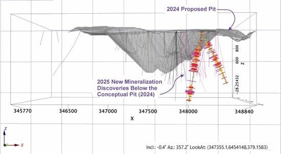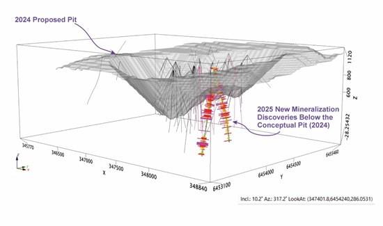 Figure 3: 2024 Conceptual pit shell in 3D and 2025 drill holes demonstrating the strategic exploration in 2025