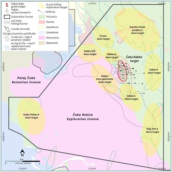 Figure 4. Overview map of Čoka Rakita exploration licence outlining the exploration targets subject of the scout drilling campaign