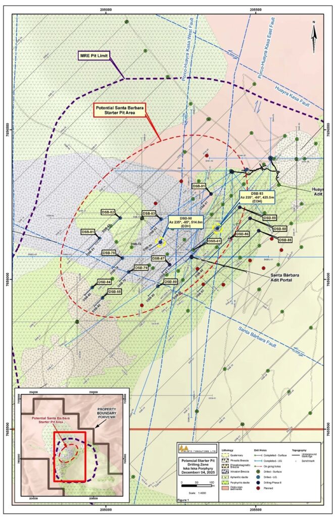 Since September 4, 2024 the Company has completed 27 drill holes totalling 14,085.80 metres of definition drilling in 2 distinct phases of diamond drilling in the potential starter pit area of the Santa Barbara Zone. This drilling has continued to intersect strong, broad zones and high-grade mineralization with good continuity in both the predominant Sn-Ag domain to the west (15 drill holes) and in the predominant Ag-Zn-Polymetallic domain to the east (12 drill holes). Both zones remain open along and across strike as well as downdip.