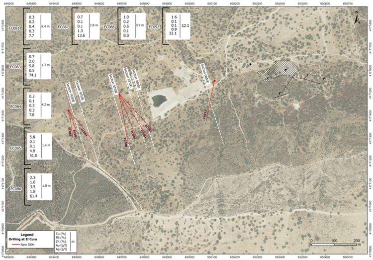 In the lower west of the deposit, holes EC085 and EC087 continue to expand the mineral resource boundary, as they are located over 200m beyond the Company’s 2025 Indicated Mineral Resource Estimate limits (please see the Company’s technical report for the IBW Project titled “NI 43-101 Technical Report on the Iberian Belt West Project, Spain” with an effective date of February 26, 2025 on the Company’s website or under the Company’s profile on SEDAR+ for further details). The western extension remains a priority for the Company’s ongoing drill program.