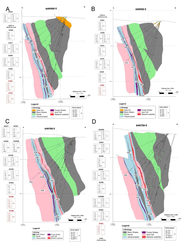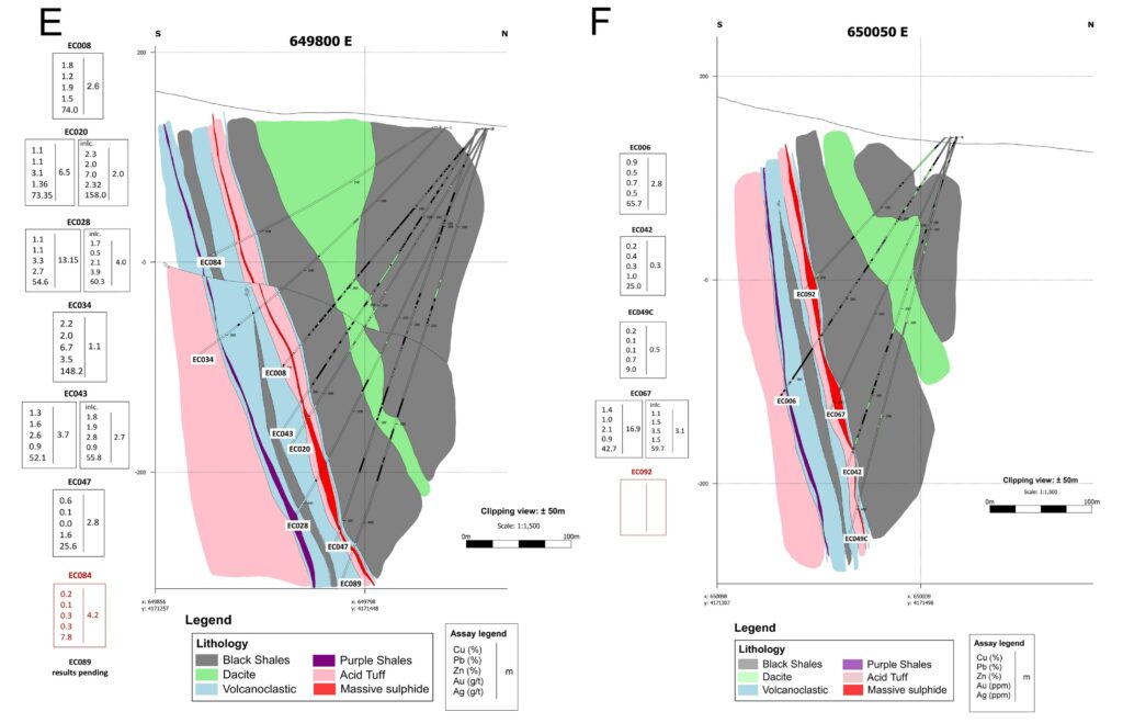 The upper central area in the vicinity of EC007 (2.2m @ 2.9% copper, 2.3% lead, 4.6% zinc, 2.81 g/t gold, 82.50 g/t silver) was tested with four additional holes- EC081, EC084, EC086, and EC088. Results are consistent with EC007, exhibiting a narrow, copper-gold enriched interval within a broader zone of average grade material.