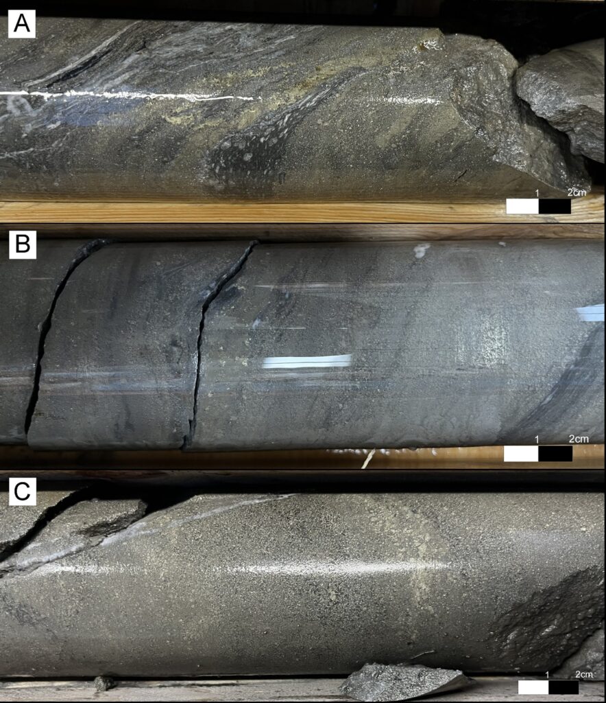Figure 5. Photoplates of El Cura drillcore as described in this release: A: EC081 semi-massive sulphide with centimetric chalcopyrite crystals and veinlets in pyritic matrix within a felsic tuff. B: EC083 pyritic massive sulphide with variable grain size and chalcopyrite as millimetric crystals. C: EC084 pyrite-rich semi-massive sulphide with millimetric chalcopyrite veinlets and crystals.