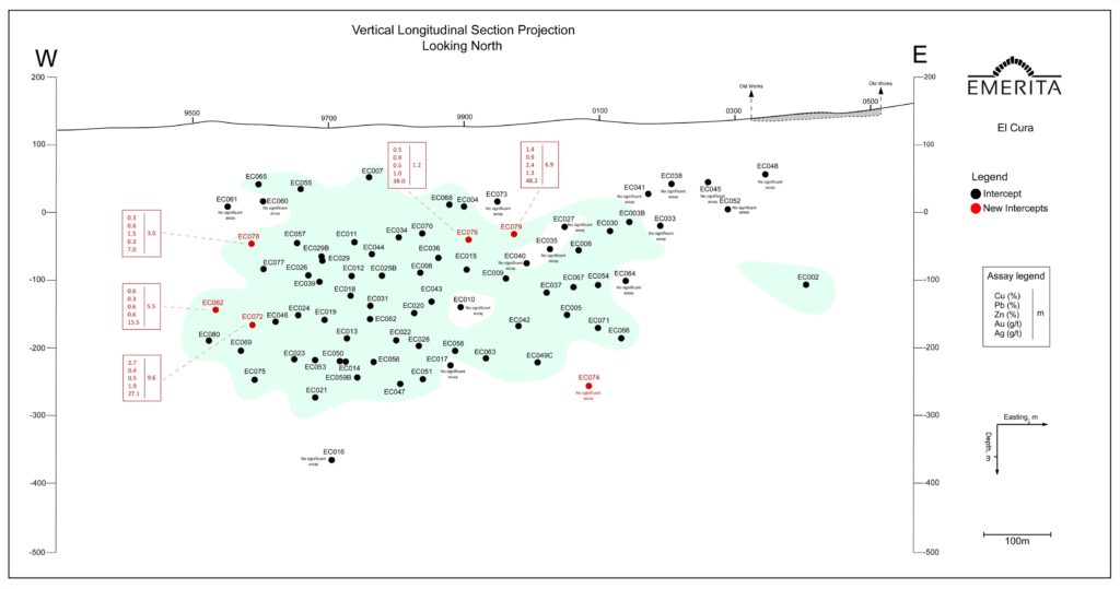 Results include two shallow-level resource holes in central El Cura (EC076, EC079); three drill holes towards the west of the currently delineated deposit (EC078, EC072, EC082); and one hydrological  hole for geotechnical purposes in the lower east area.  All holes intercepted massive and semi-massive sulfide except for the geotechnical hole, which was designed to provide water-balance data for future mine planning.