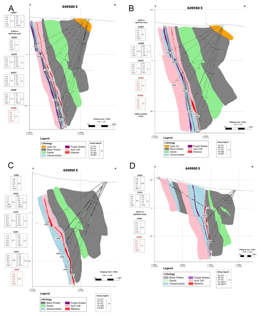 • Drill hole EC079: 6.9m grading 1.4% copper, 0.9% lead, 2.4% zinc, 1.32 g/t gold and 48.22 g/t silver.