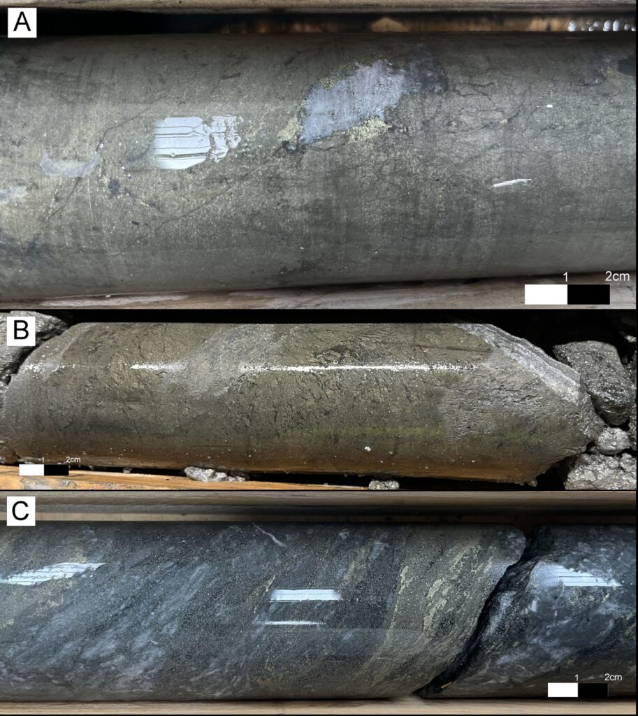 Figure 5. Photos of El Cura drillcore: A: EC072 fine grained chalcopyrite crystals occur in association with hydrothermal quartz veins. B: EC076 Fine grained massive sulphide with pyritic matrix and millimetric veinlets rich in sphalerite and galena, locally containing disseminated chalcopyrite along microfractures. C: EC078 Banded polymetallic sulphide with layers of sphalerite galena–chalcopyrite within a felsic tuff.
