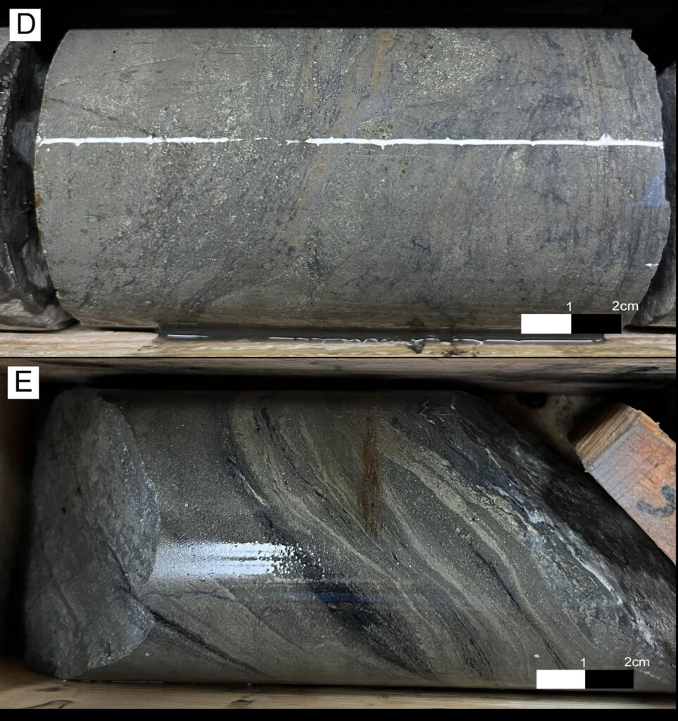 Figure 5 continued. Photos of El Cura drillcore: D: EC079 massive sulphide with pyritic matrix and milimetric sphalerite/galena rich veinlets within some chalcopyrite in millimetric crystals. E: EC082 pyritic rich massive suphide with chalcopyrite in millimetric veinlets.