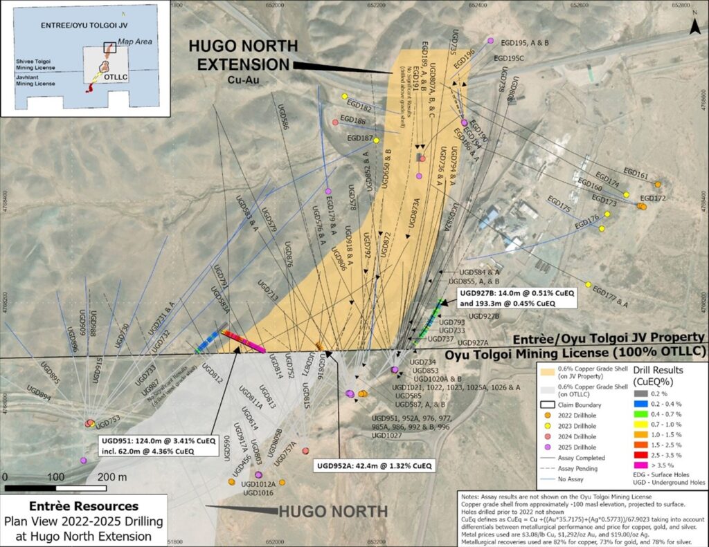 The Company is pleased to provi de analytical results for one surface diamond drill hole and 4 underground DDHs, which were part of the 2024 and 2025 in-fill drilling programs at the Hugo North Extension deposit on the Entrée/Oyu Tolgoi joint venture property in Mongolia. Regional exploration results are also provided, including analytical results for nine DDHs from the 2025 regional drilling campaign testing several targets on the Shivee Tolgoi and Javkhlant mining licences. All work was completed by the Company’s joint venture partner OT LLC, with expenditures borne by OT LLC and Entrée in proportion to their participating interests in the Entrée/Oyu Tolgoi JV.