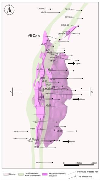 The deepest drilling to date within the VB Zone, is highlighted by hole VB-47 that intercepted two intervals of disseminated nickel sulphide mineralization, 20.7 meters grading 0.47% NiEq and 9.8 meters grading 0.53% NiEq, the latter of which is approximately 450 meters below surface.