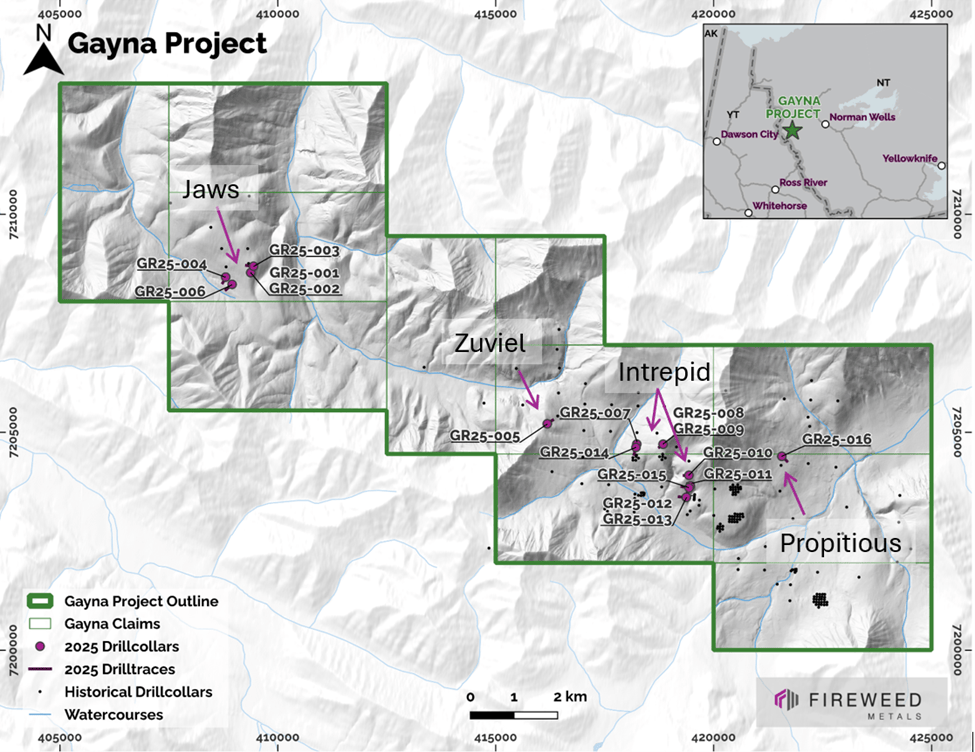 Fireweed has completed its inaugural drill program at the Gayna Property in the Northwest Territories, marking the first drilling at the project since the late 1970s (Figure 1). The 2025 program totaled approximately 3,800 m and tested a new exploration model targeting steeply dipping Zn-Pb-Ag sulphide mineralization hosted within Neoproterozoic reef margins. Drilling has advanced Fireweed’s understanding of the geological system and confirmed significant mineralization at the Intrepid target, an area interpreted to be directly underneath the mapped contact of the reef margin at surface. The drill holes in this release comprise intervals of vein-hosted and replacement-style zinc-lead mineralization (in the form of sphalerite and galena) from various targets at the Gayna property.Potential for reef-margin massive sulphide mineralization remains at several targets on the property.