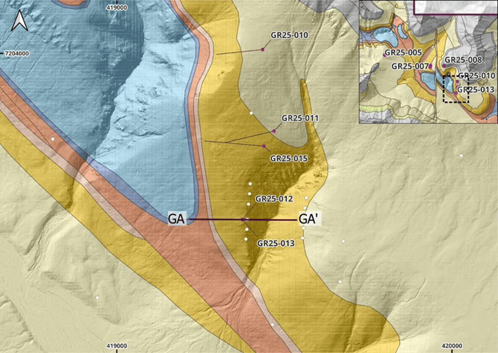 Figure 5: Cross section GA to GA’. GR25-012 and GR25-013 composite intervals.
