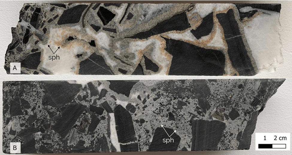 Figure 6: (A) Grey and orange sphalerite (sph) mineralization rimming clasts in a carbonate breccia from 42.81-43.00 m in GR25-013. (B) Grey sphalerite partially replacing the matrix of a sedimentary breccia from 117.24-117.42 m in GR25-013.