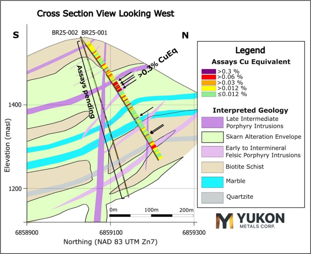 Figure 3 – Cross Section View of Hole BR25-001 with Copper Equivalent and Geologic Interpretation.