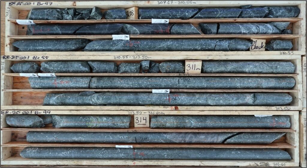 Figure 5 – Hole BR25-001 around 311m. Crowded porphyritic intrusion unit with minor disseminated sulphides and anomalous copper values.