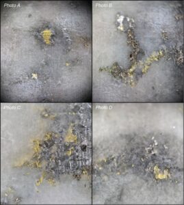 Photo 2. Photos of coarse visible gold and bismuthinite from a ~10 cm wide vein in drill hole ALT-25-012 (287.32 – 288.24 m).