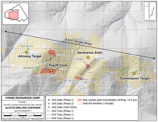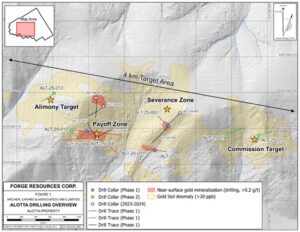 PJ Murphy, CEO of Forge Resources, states: “We are extremely excited by the exceptional high-grade gold results from hole ALT-25-012, which returned 105 g/t Au over 1.25 metres. This intercept highlights the strong high-grade gold potential at Alotta and complements the broader, bulk-tonnage style mineralization at the Payoff Zone. The consistently strong gold grades and wide mineralized intervals encountered to date further confirm the strength, continuity, and scale of this growing gold system, which begins right at surface. Multiple instances of visible gold within quartz veining underscores the robustness of this mineralized corridor. As we advance exploration, the Company will prioritize several large ‘bull’s-eye’ targets defined by coincident copper, gold, and molybdenum soil anomalies and supporting geophysical signatures. We look forward to receiving the multi-element results from the rushed samples of hole ALT-25-012, along with the remaining assays from our Phase 2 drilling program.”