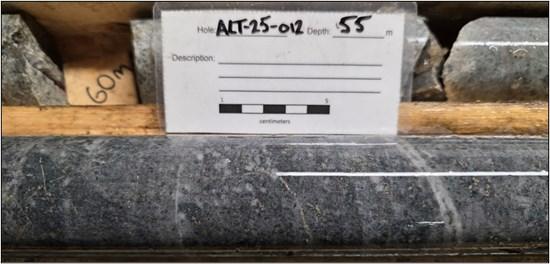 Hole ALT-25-012 drilled through granodiorite and porphyritic rocks and intersected widespread, near-surface alteration, veining, and sulphide mineralization. Alteration includes pervasive secondary biotite that is overprinted by intense silicification, and widespread chlorite and sericite alteration, which become stronger around areas of veining (Photo 3). Vein-hosted pyrite, molybdenite, chalcopyrite, and pyrrhotite were commonly observed in quartz veins, with the strongest veining and mineralization found in the top 100 metres of the drill hole (Photo 4).