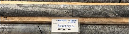 Photo 1. Quartz vein from drill hole ALT-25-012 (reported) with coarse native gold (287.32 – 288.24 m).