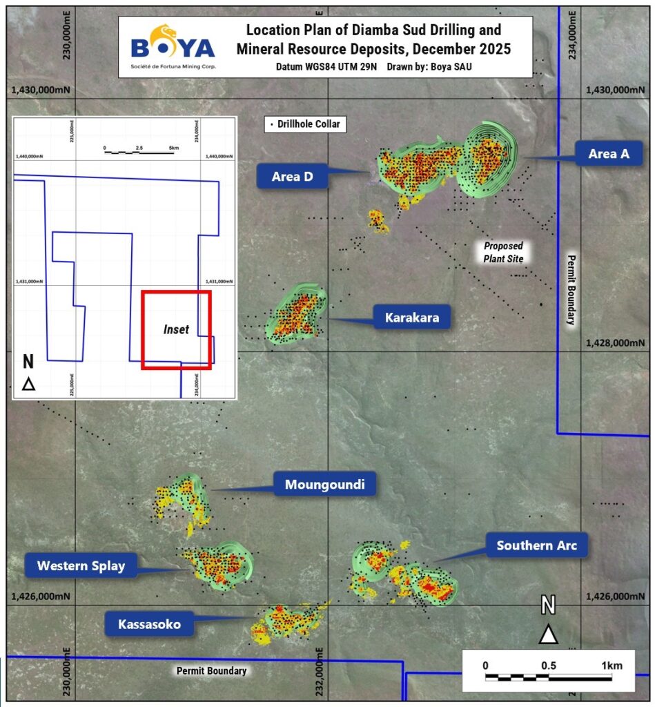 Figure 1: Location plan showing Diamba Sud drilling and Mineral Resource Deposits