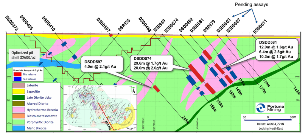 | DSDD567: | 4.6 g/t Au over an estimated true width of 26.6 meters from 96.8 meters, including 15.6 g/t Au over an estimated true width of 0.8 meters from 103 meters, and 13.6 g/t Au over an estimated true width of 1.6 meters from 105 meters, and 18.3 g/t Au over an estimated true width of 1.6 meters from 114 meters |