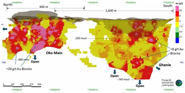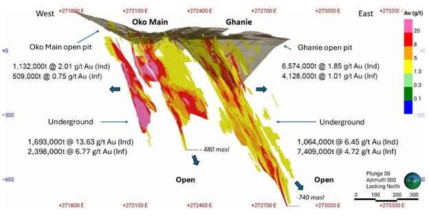 Figure 4 – OMZ & Ghanie Deposits Vertical Section Looking North: HG Blocks with OP and UG Mining Constraints