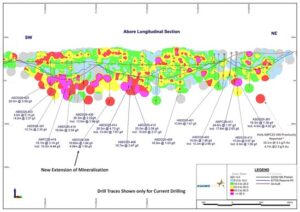 Figure 1: Long section through the Abore deposit showing gram meter contours of Au intercepts with highlights of current drilling labelled.