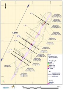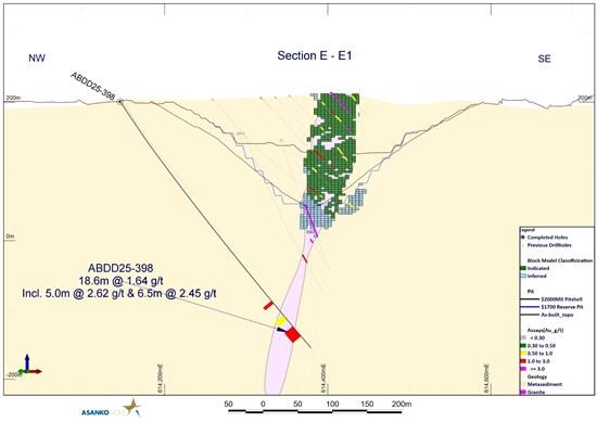 Figure 5: Cross section E-E1 showing hole ABDD25-398 illustrating the presence of high-grade mineralization 150m below the Mineral Resource and 80m below known mineralization at Abore Main pit.