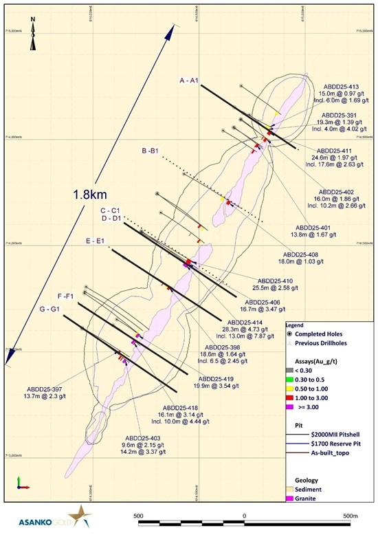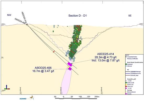 Figure 4: Cross section D-D1 showing holes ABDD25-414 and ABDD25-406 within the high-grade ore shoot under Abore Main pit showing the continuity of high-grade mineralization within this portion of the mineralized zone which remains open at depth.