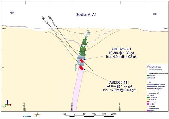 Figure 3: Cross Section A-A1 showing holes ABDD25-391 and ABDD25-411 at Abore North pit below the Mineral Resource with high-grade mineralization open at depth.