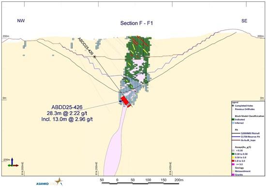 Figure 6: Cross section F-F1 showing hole ABDD25-426 located within the saddle zone between Abore Main and South pits which has confirmed good continuity of high grades within this mineralized zone.