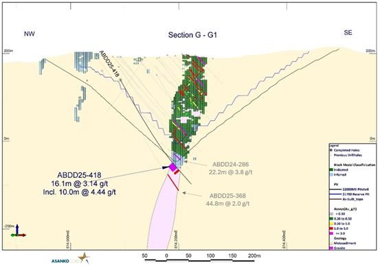 Figure 7: Cross section G-G1 showing hole ABDD25-418 drilled as an infill within the high-grade ore shoot below South pit showing an example of continuity of high-grade mineralization between previous drill holes.