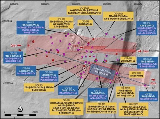 Recent drilling has been focused on extensions to the currently known high-grade copper skarn extents of the “Southern Limb”. It was designed to test the continuity of high-grade copper mineralization over more than 400m between CPG-071D1 (78 metres at 0.92% Cu, including 20 metres at 1.55% Cu) and CPG-033 (33m @ 0.82% Cu, including 22m @ 1.02% Cu) (Refer Figures 1-2).