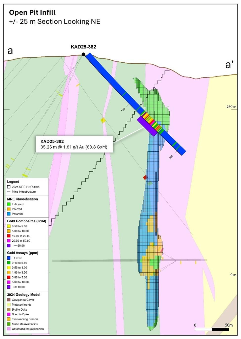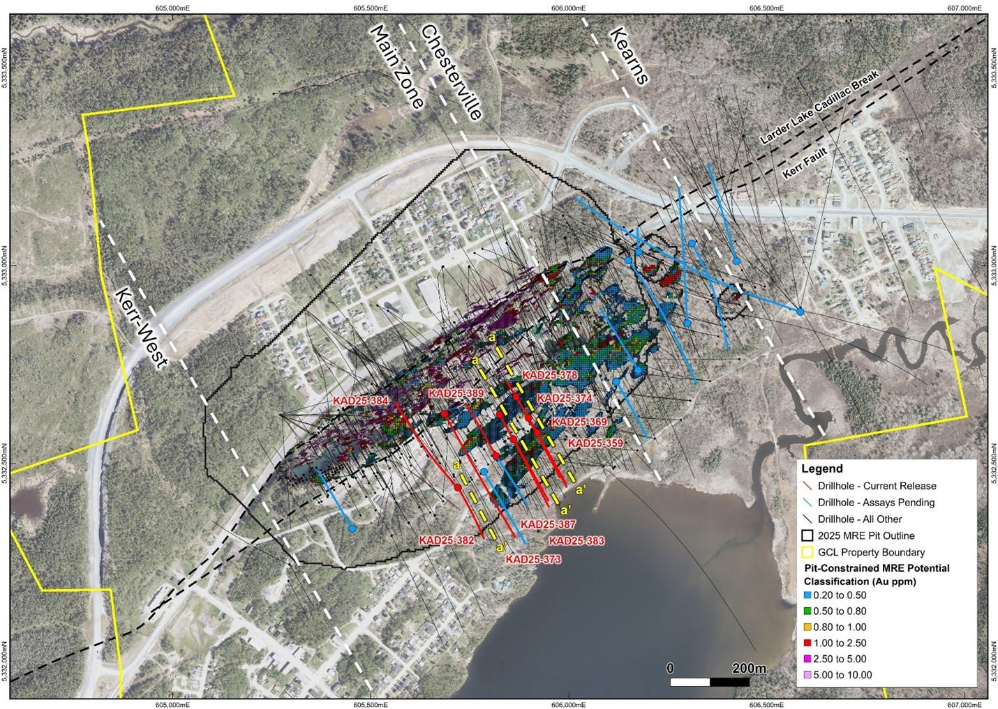 Gold Candle Ltd. (Private) is pleased to provide additional assay results returned from delineation drilling targeting stacked footwall lenses within, and immediately adjacent to, the existing Kerr-Addison open pit mineral resources. The drilling was part of the previously reported Open Pit Infill and Chesterville East exploration program (14,100 metres over 49 holes) completed in 2025.