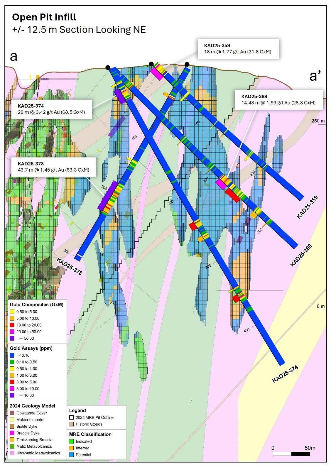 The assays from the Footwall Main Zone drilling returned higher grade intervals than widely spaced historic drilling and outline the potential for a mineralized corridor of three to four stacked lenses, striking northeast for approximately 400 metres with a width of approximately 300 metres, located immediately southeast of the Kerr-Addison main zone (Figure 1). Using a 20 GXM (grams per tonne x metres) threshold, 10 holes returned significant intercepts with six of the 10 holes including gold grades over 1.35 grams per tonne where the May 2025 InnovExplo block model had interpolated limited mineralization: