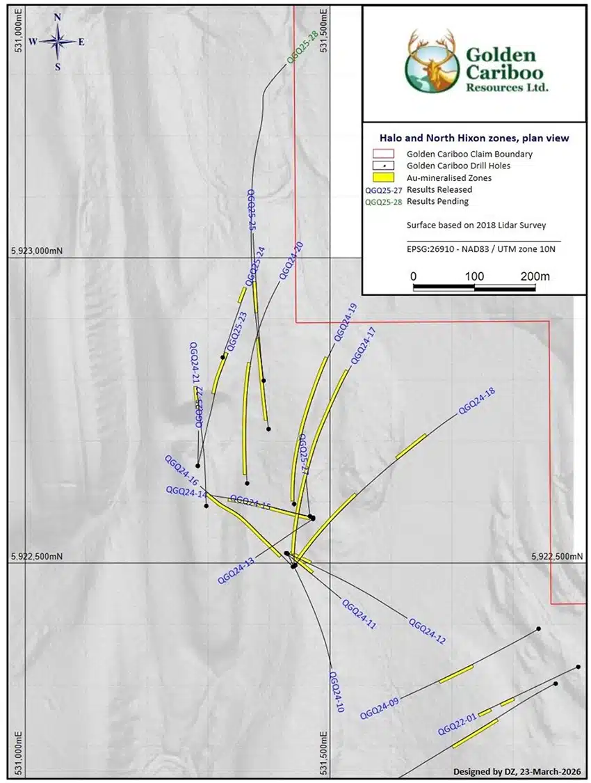 Golden Cariboo Resources Ltd. (CSE:GCC) (OTC:GCCFF) (WKN:A402CQ) (FSE:3TZ) announces that drill hole QGQ25-28 was completed on March 19, 2026 to a total length of 754.69 m (2,476 ft), ending in mineralization approximately 12 m (39.37 ft) from Osisko Development Corp.’s claim boundary. The work was carried out at the Company’s Quesnelle Gold Quartz Mine Property, located approximately 4 kilometers northeast of Hixon and 50 kilometers southeast of Prince George, British Columbia.