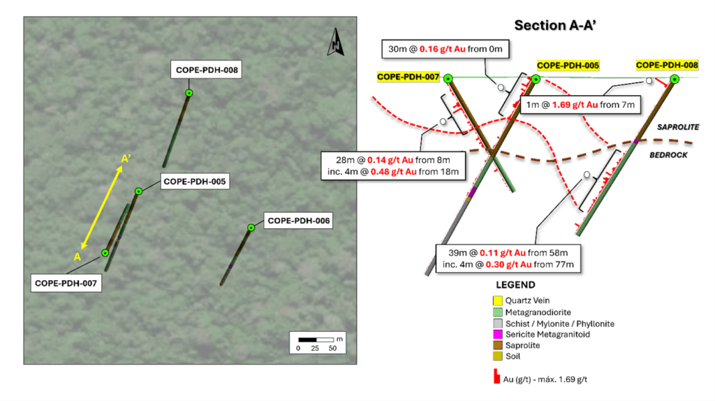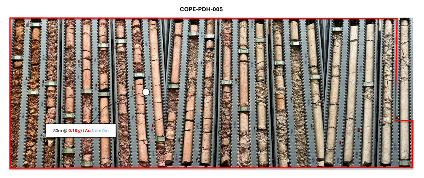 | COPE-PDH-005 | 0.0 | 30.0 m | 0.16 | 0.20 over 22.0 m | Sheeted Qtz veins in gneiss (saprolite) |